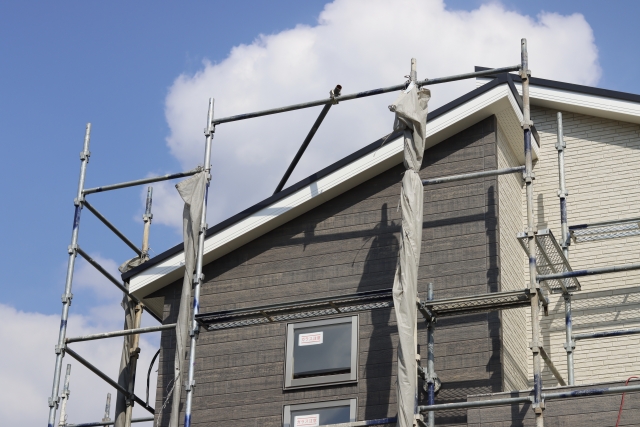 外壁塗装では高所の作業に伴い足場を設置し、建物の周りを養生ネットで囲みます。