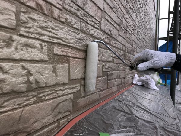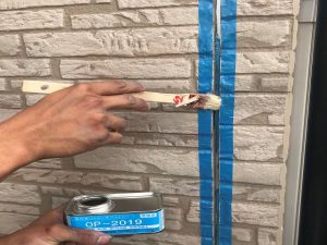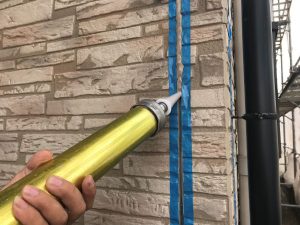 足場の設置工事が終わり、既存のシーリングを撤去していきます。シーリングを充填する部分に沿って養生テープを張ります。プライマー塗布し、シーリングを充填していきます。シーリング用のヘラで押さえながら仕上げていきます。