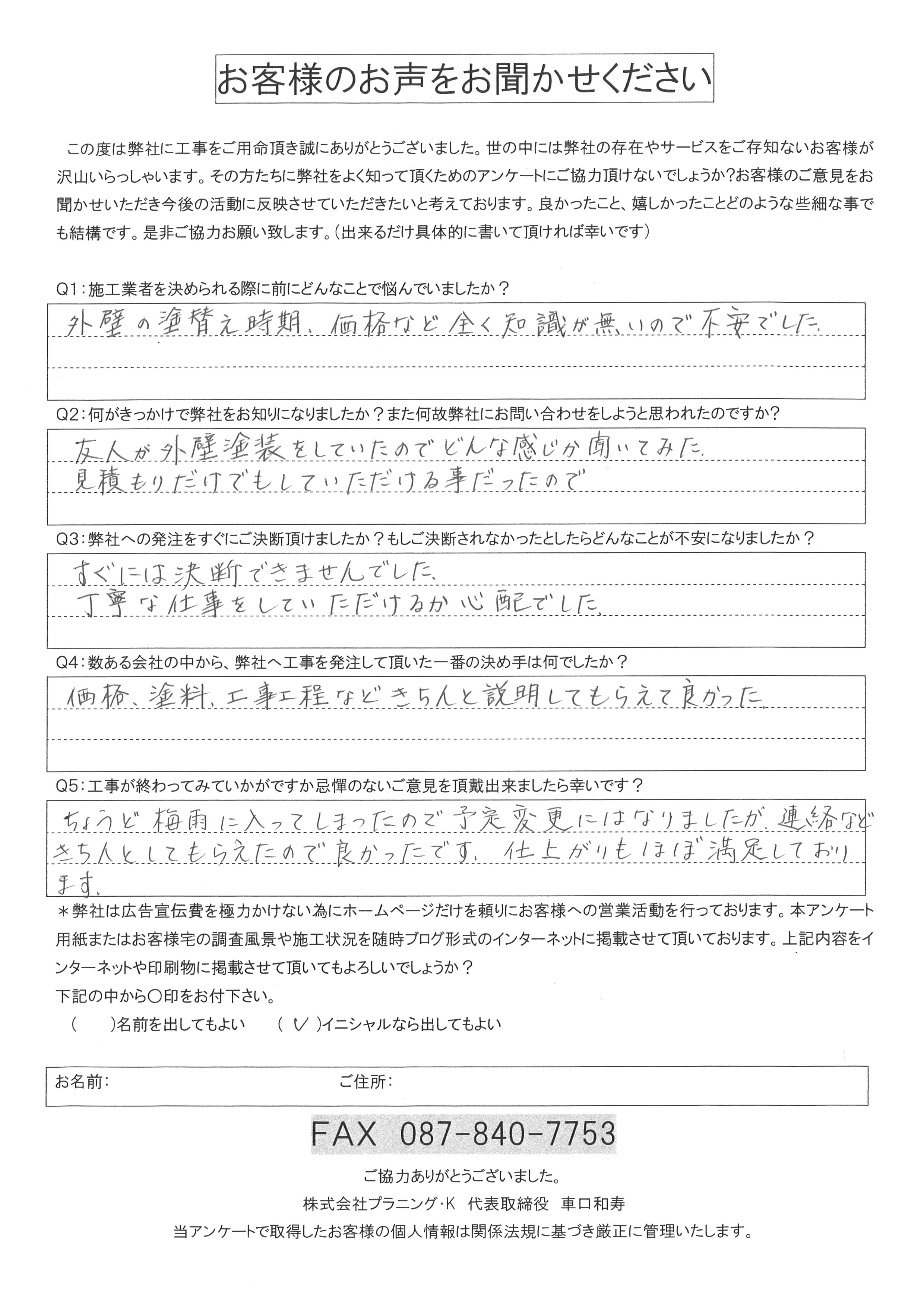 ・価格、塗料、工事工程などきちんと説明してもらえて良かった。