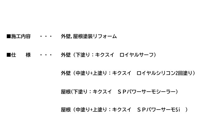 外壁塗装は「キクスイ ロイヤルシリコン」を、屋根塗装は遮熱形塗料「キクスイ SPパワーサーモSi」をご提案しました。
