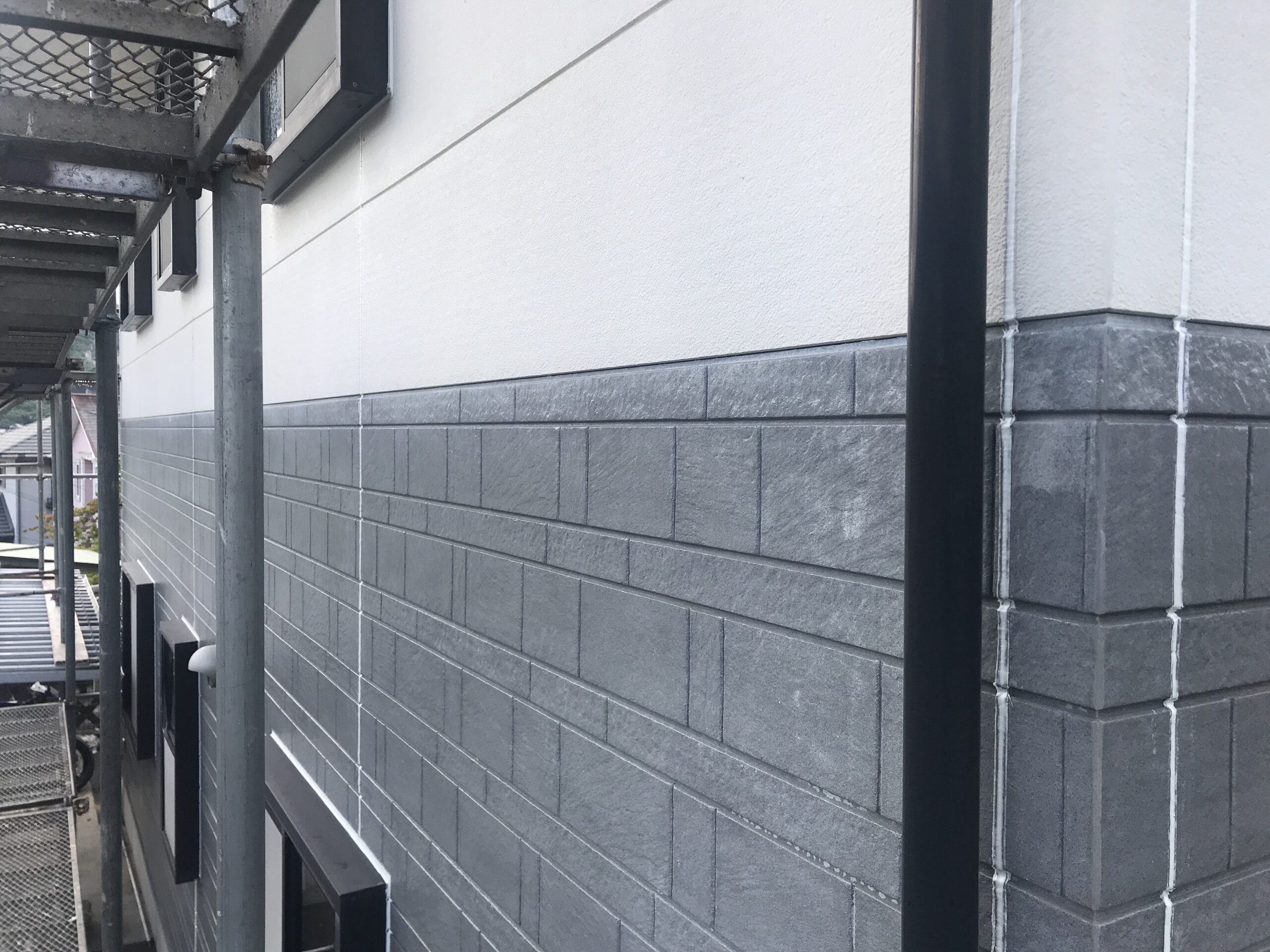 鉄骨階段,鼻隠し,軒樋,竪樋など鉄骨部分はケレン作業後にサビ止めを塗布しウレタン樹脂塗料で仕上げます。