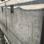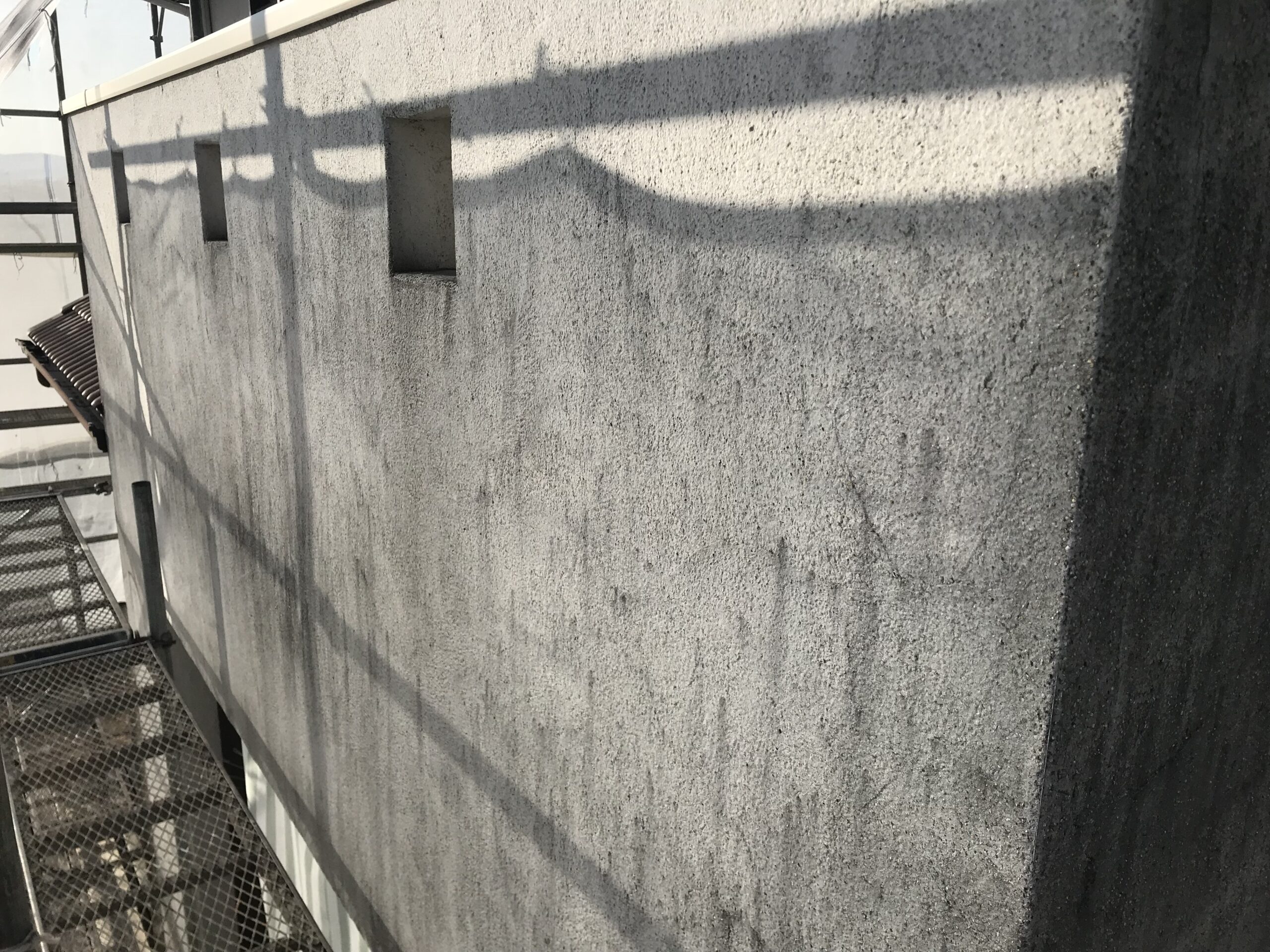 外壁の黒っぽい汚れは、退色と雨だれによるものです。ホコリや排気ガスが付着してしまった汚れです。