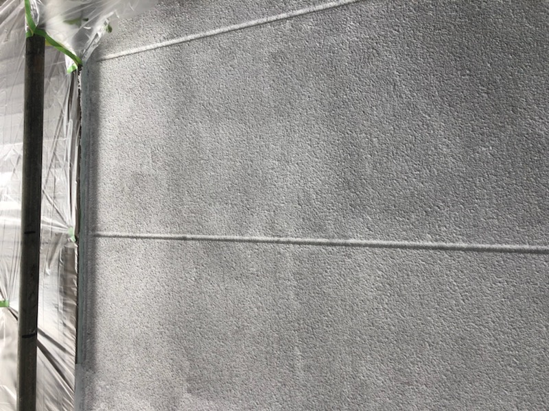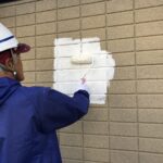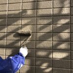 既存の壁にローラーで白い塗料を塗っています。これは下塗り塗料「キクスイ ロイヤルフィラー」です。下塗り塗料は熱伝導率を下げる効果があり断熱効果も期待できます。中塗り・上塗り塗料「キクスイ ロイヤルシリコン」を2回塗っていきます。紫外線によるよる劣化を抑えて抜群の耐候性で家を守ります。艶がよくキレイに仕上りました。