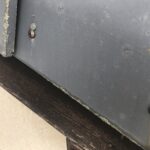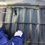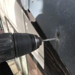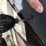 既存の写真を見ると袖瓦のビスが飛んでしまい瓦のズレが生じています。補修用ビスを打つ穴をていねいに開けて新しくビスを打ちます。